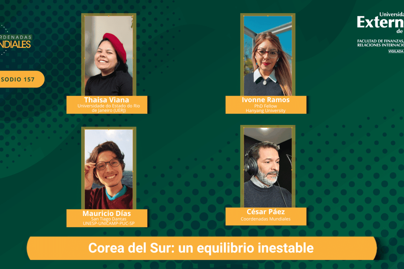Para entender la situación actual de Corea del Sur, sus relaciones con su hermana del norte, el delicado equilibrio que mantiene con China, Japón y Estados Unidos, y su importancia en la cooperación internacional, nos acompañan: desde Hangyang, Ivonne Ramos, de la universidad de esa ciudad sudcoreana; desde Río de Janeiro, Tahisa Viana, de la Universidade do Estado do Rio de Janeiro (UERJ), y desde San Pablo, Mauricio Días, del Programa de Pós-Graduação em Relações Internacionais San Tiago Dantas UNESP – UNICAMP – PUC-SP.